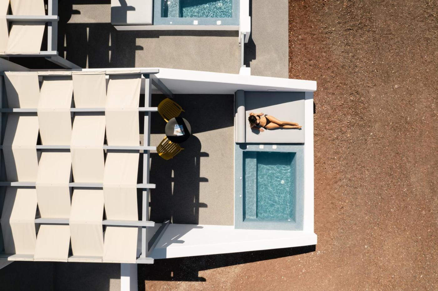 Deluxe Suite with Outdoor Mini Plunge Pool & Caldera View. This suites standout feature is the spa bath. Boasting a private entrance, this air-conditioned suite includes 1 living room, 1 separate bedroom and 1 bathroom with a shower and a hairdryer. Featuring a terrace with sea views, this suite also offers a coffee machine and a flat-screen TV. The unit has 2 beds.