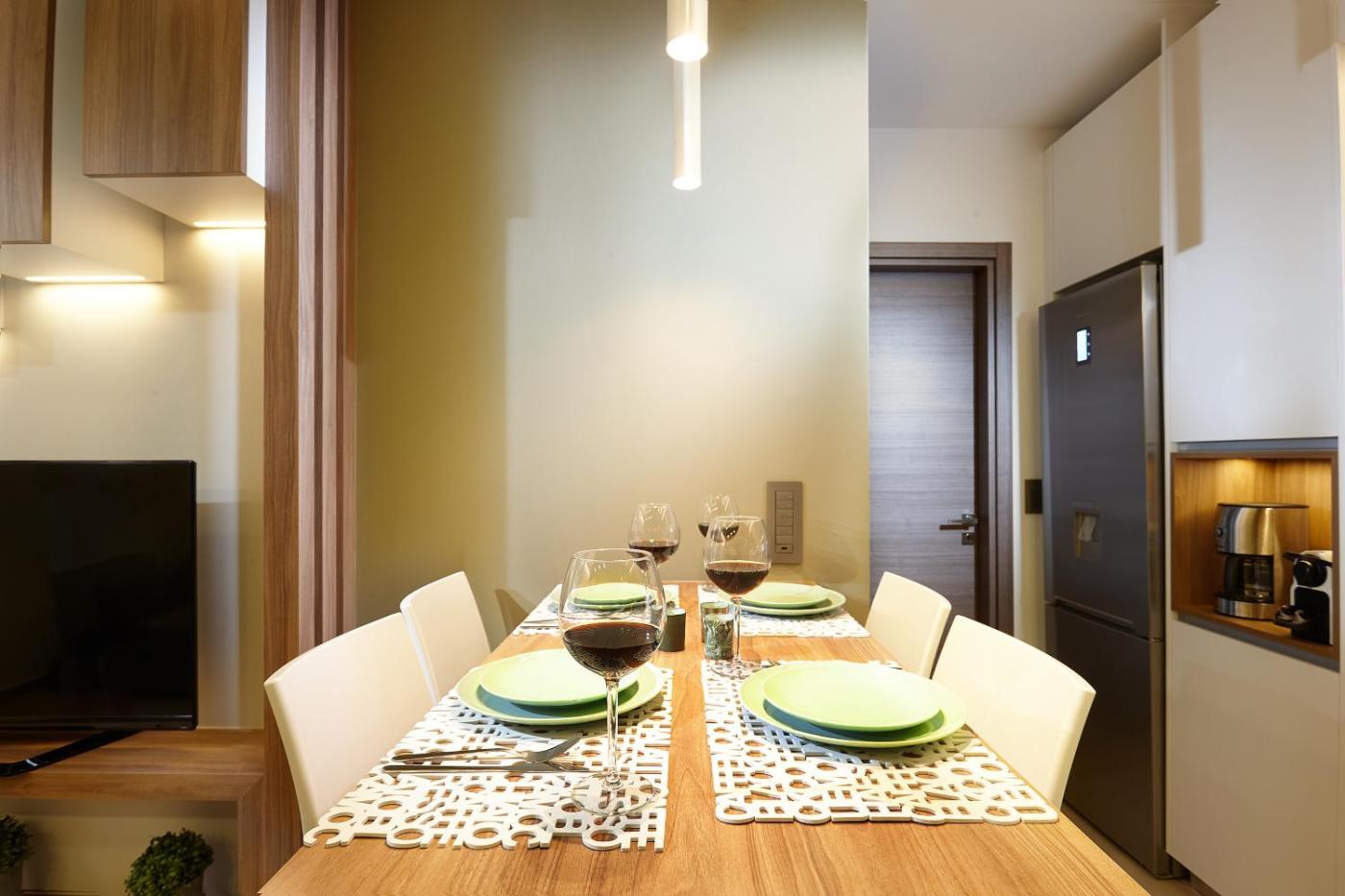 Two-Bedroom Apartment. Guests can make meals in the kitchen that features a stovetop, a refrigerator, kitchenware and an oven. The spacious air-conditioned apartment features a flat-screen TV, a washing machine, soundproof walls, a tea and coffee maker as well as city views. The unit has 4 beds.