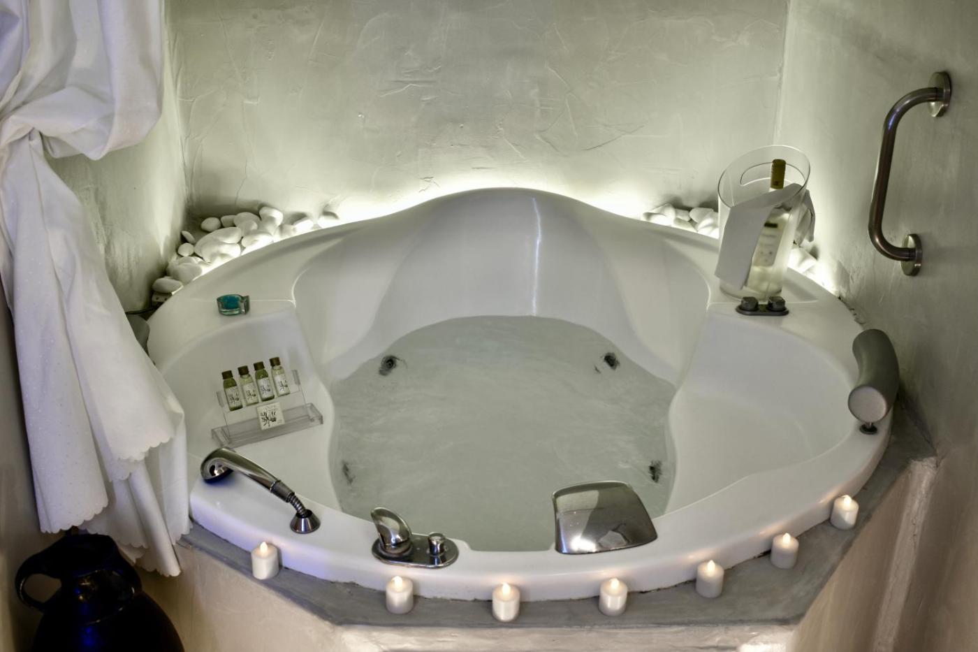 Ikaros Executive Cave Suite 2 Indoor Jetted Tubs & Outdoor Jetted Tub. Ikaros Executive Cave Suite 2 Indoor Jetted Tubs & Outdoor Jetted Tub Featuring 2 bedrooms and 2 spacious bathrooms, each with a indoor heated jetted tub, this cave suite with no windows, has a separate seating area with sofa and dinning area for 4 people with a fully equipped self catering kitchenette. It offers a big veranda with an outdoor jetted tub for 2-4 adults (not heated) and views over the volcano, the sea and the sunset. A bottle of wine and a bottle of mineral water are offered upon arrival. ;
