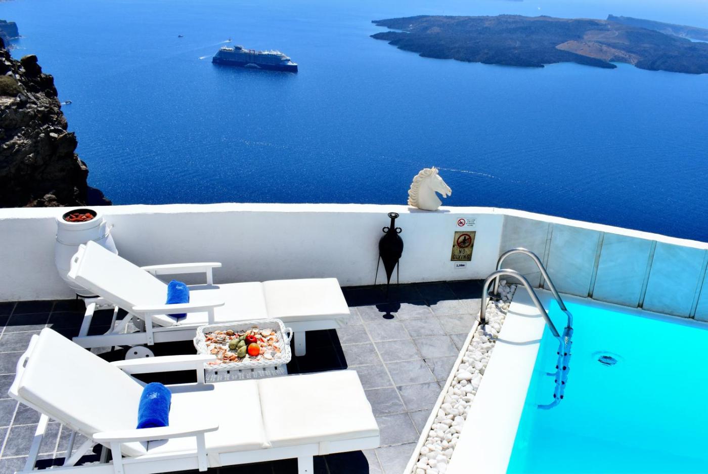 These cliff-top Santorini self catering studios and suites are eco-friendly and offer a spectacular panorama of the Caldera and the Aegean Sea. Some suites include a private balcony facing the sea view with a non heated open-air Jetted Tub and inside also with an indoor heated Jetted Tub, and few suites have only an indoor heated Jetted Tub with a non private balcony. An outdoor shared pool forsuites ( non private ) with terrace is available overlooking a breathtaking view.