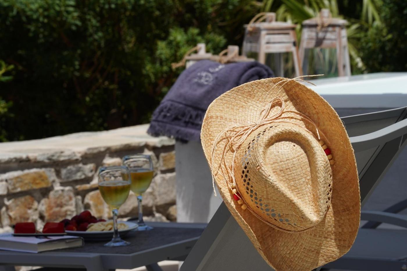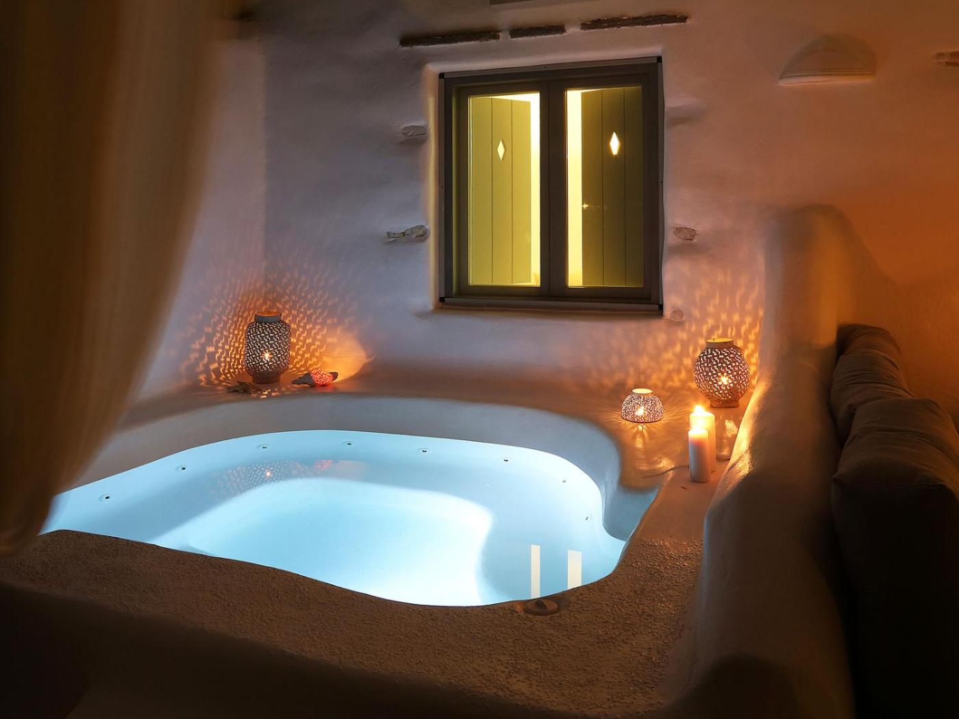 Honeymoon Sea View Villa. This luxurious villa has a large terrace with built-in hot tub and open views. It includes a seating room with a Smart TV with satellite and cable channels. It also has a fully equipped kitchen with a full-size refrigerator, utensils, cooker, coffee maker and dining table. Amenities include free Wi-Fi, air conditioning, iron and ironing board, hairdryer, safe-box, natural hair and skin care products, slippers, bathrobes and face, bath & swimming pool towels. This room type cannot accommodate any extra beds. ;