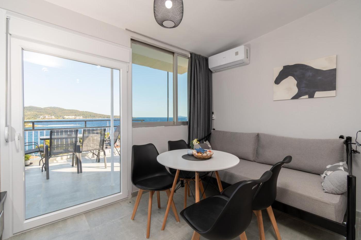 Studio Apartment with Sea View. The air-conditioned apartment features 1 bedroom and 1 bathroom with a shower and a hairdryer. Meals can be prepared in the kitchen, which is equipped with a stovetop, a refrigerator, kitchenware and a tea and coffee maker. Featuring a terrace with sea views, this apartment also provides a washing machine and a flat-screen TV. The unit offers 2 beds.