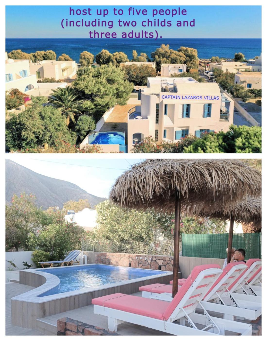 The area is popular for cycling, and car hire is available at the villa. Located by the sea one Beachfront Detach Private Captain Lazaros Pool Villa with loft in 750sqm spacious private plot-Jacuzzi-sunrelax-furnished terace-gazebo-private parking, sleep 3 adults and 2 children, just steps from the Black Beach-Seaview has a childrens playground and a picnic area.