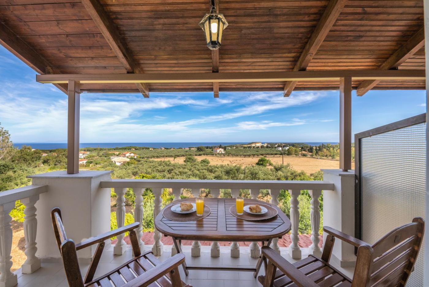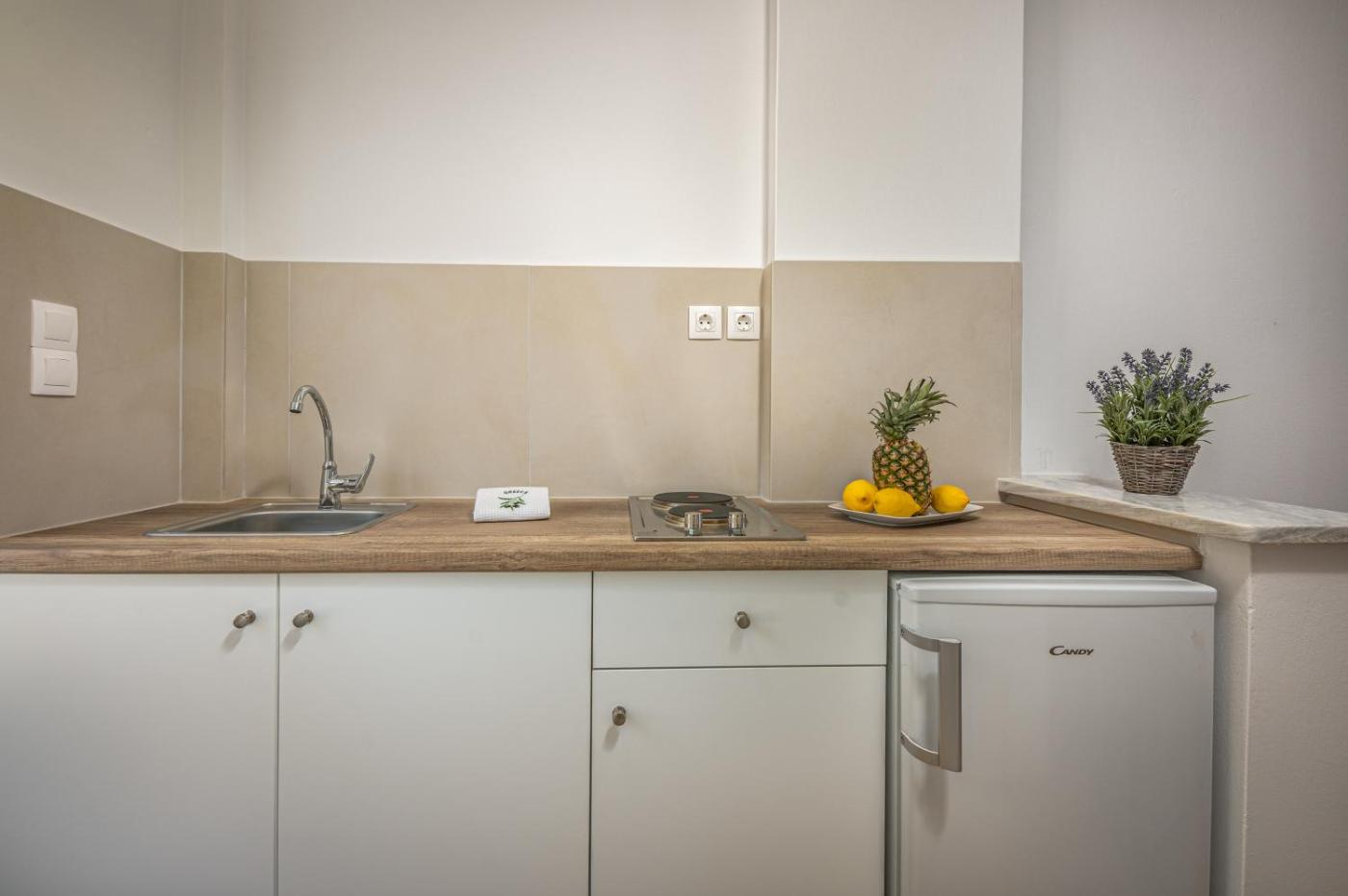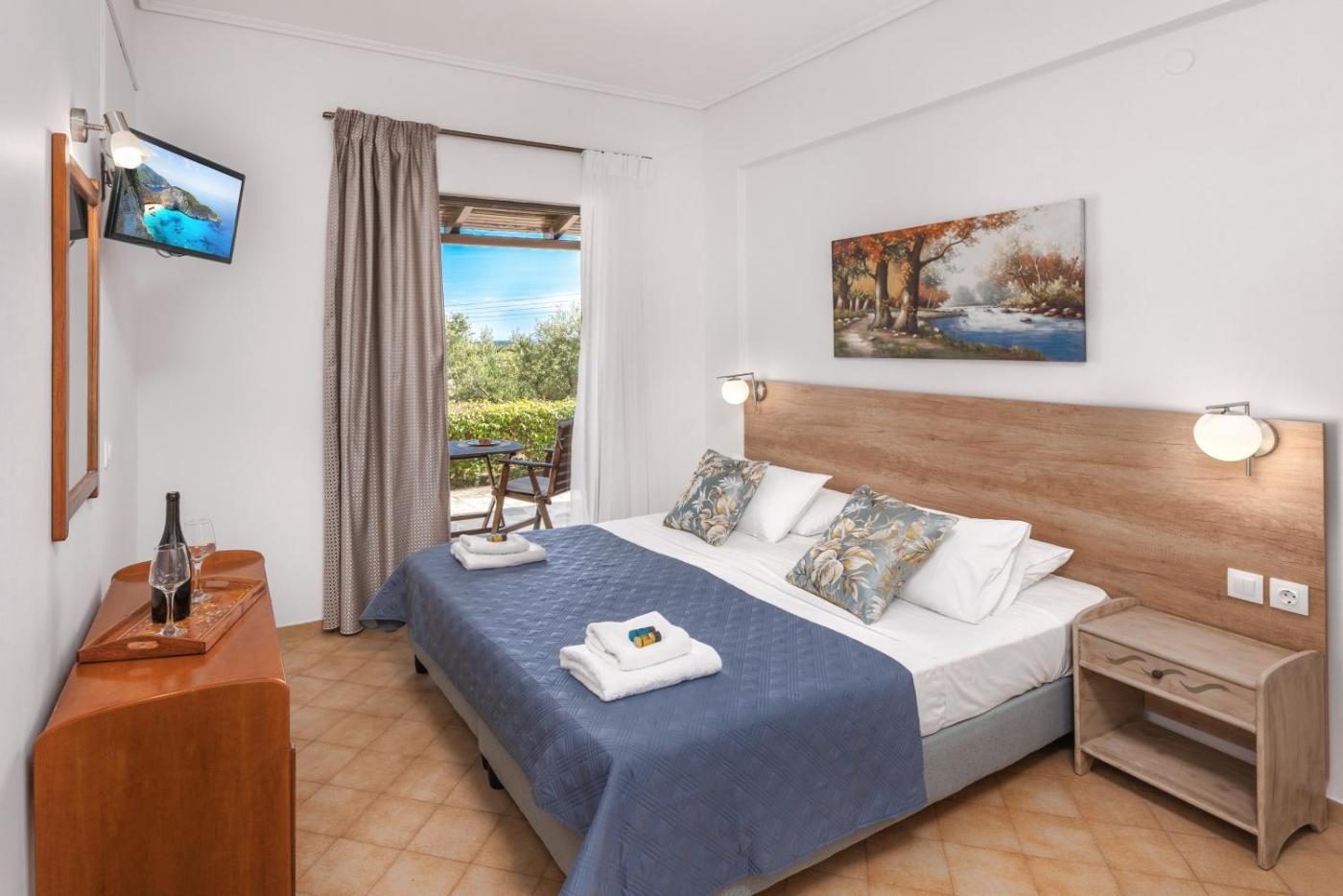 Two-Bedroom Apartment. Located on the upper floor, this air-conditioned apartment offers a balcony overlooking the Ionian Sea and garden. It includes: -kitchenette with fridge and teacoffee maker -TV Housekeeping is provided daily. Towels and linens are changed every 3 days.