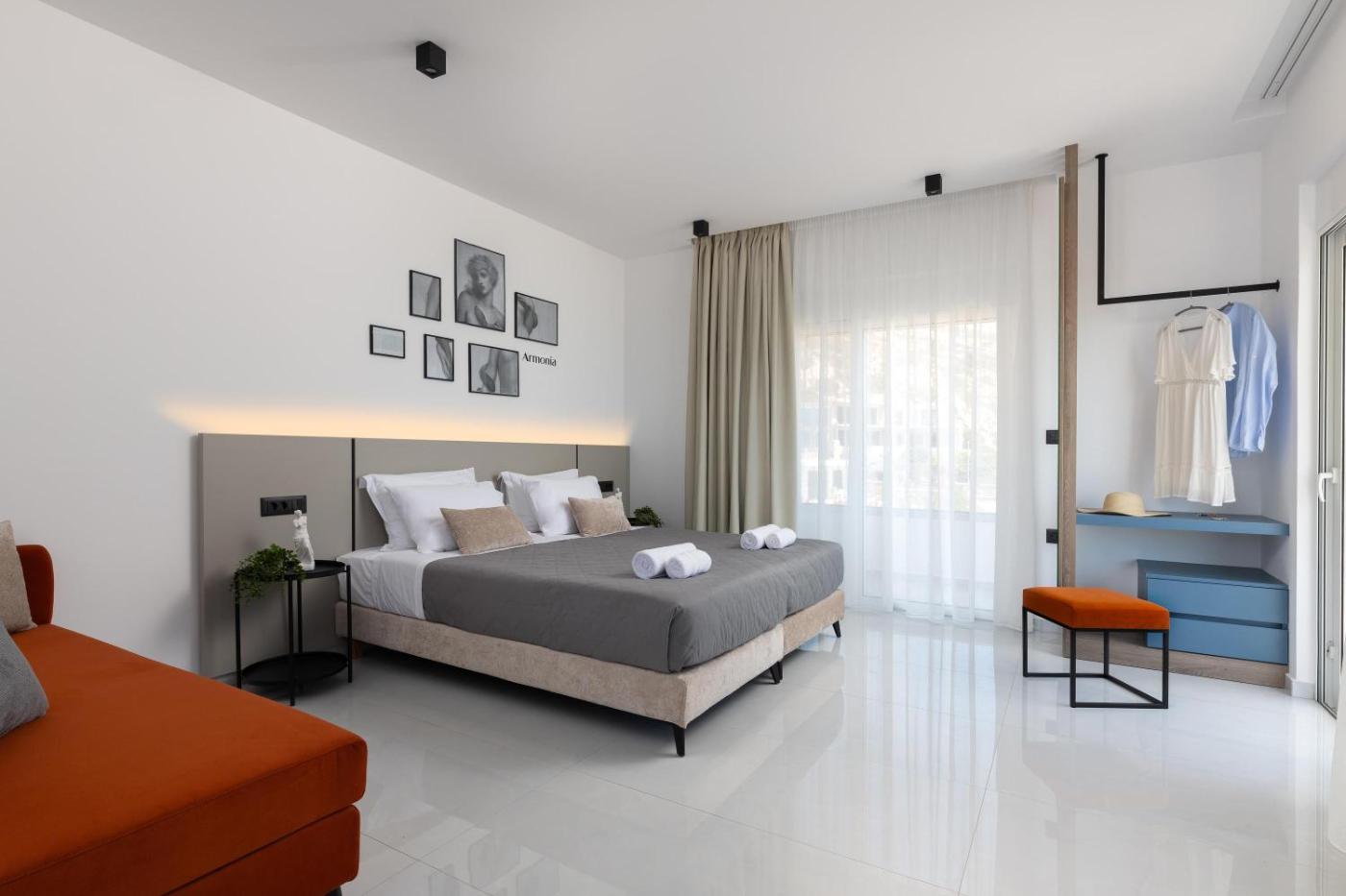 Armonia Residence. The air-conditioned apartment features 1 bedroom and 1 bathroom with a shower and a hairdryer. Meals can be prepared in the well-fitted kitchenette, which is fitted with a stovetop, a refrigerator, kitchenware and an oven. This apartment has a washing machine, flat-screen TV with satellite channels, sea views, as well as winechampagne for guests. The unit offers 2 beds. ;