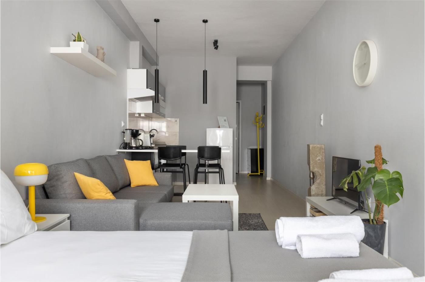 One-Bedroom Apartment. Featuring a private entrance, this air-conditioned apartment comprises a kitchen, 1 bedroom and 1 bathroom with a shower and a hairdryer. Meals can be prepared in the well-fitted kitchen, which comes with a stovetop, a refrigerator, kitchenware and an oven. The apartment provides a washing machine, a minibar, a tea and coffee maker, a flat-screen TV with streaming services, as well as mountain views. The unit offers 2 beds.