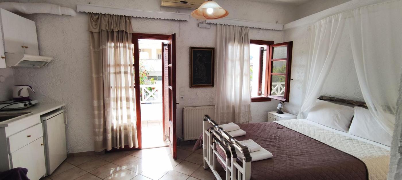 Double Room. Fitted with iron beds and woven materials, this room opens to a private balcony. It includes a kitchenette and a TV. Air conditioning is available at extra charge. ;